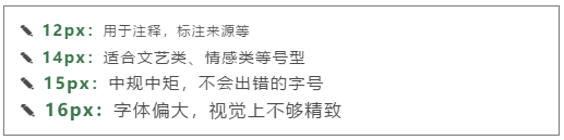 文章正文的字号建议使用14px、15px,如果字体过大,文章整体视觉上给人的感觉会不够精致;