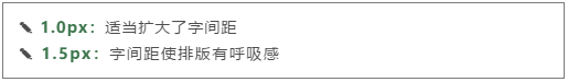 字间距建议设置为1px或1.5px,最大也不要超过2px,适当的字间距会使文章有呼吸感;
