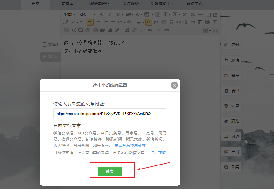3、在输入框进行粘贴刚才采集的文章网址,然后点击采集;