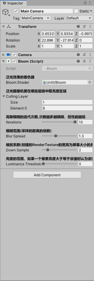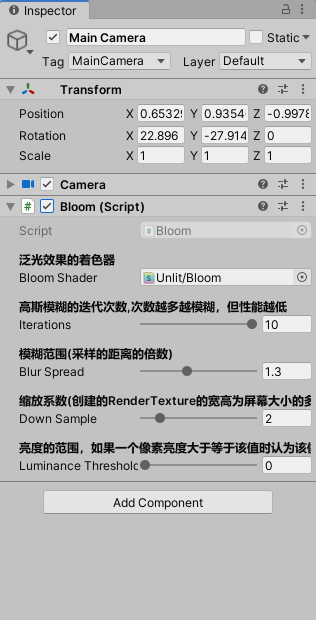 接下来我们就要想办法只让吊灯有泛光效果。这点相信很多人和我想到的是同一个办法:我们创建一个摄像机,它专门用来拍摄吊灯所在的Layer,然后获取该摄像机的渲染目标,再对该渲染目标进行亮度的提取。但是在这里我踩了一个坑,我创建了一个专门用于拍摄吊灯的摄像机之后,又在该摄像机上加了一个继承于Bloom的脚本,然后直接在该脚本的OnRenderImage中获取该摄像机的渲染目标,提取亮度,然后再进行高斯模糊与最后的混合操作。但是不知道为什么,在该脚本中获取的渲染目标总是不能应用到该脚本的OnRenderImage中。然后我转换了思路,直接在主摄像机上获取该摄像机的渲染目标,结果是可用的。