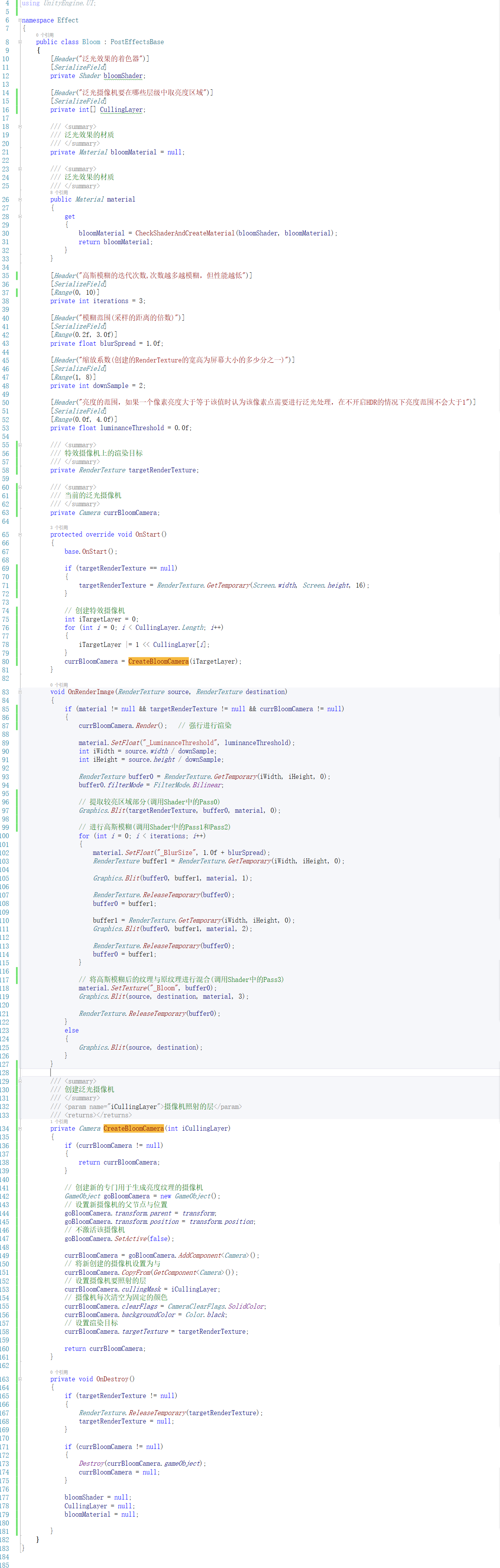 泛光效果一种比较简单的屏幕后处理的特效,可以分为以下几步实现:1.在一张纹理A中提取屏幕中的光亮区域,存储在一张渲染纹理B中;2.对B渲染纹理进行高斯模糊处理,得到纹理C;3.将经过高斯模糊处理的纹理C与纹理A进行混合,将结果输出即可。