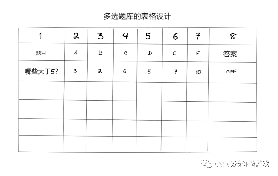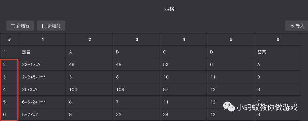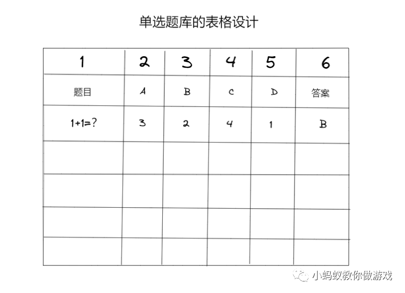 对于一个答题小程序或者小游戏来讲,表格设计好了,基本上就完成了一半了。我们回看一下上方的这两个简单的表格,利用表格的行和列,非常方便的就能够将每一道题(一行)和每一道题目中的所有信息(一列)区分出来。我们根据行来获取题目,然后根据列来获取题目中的具体信息(题目,选项,答案)。