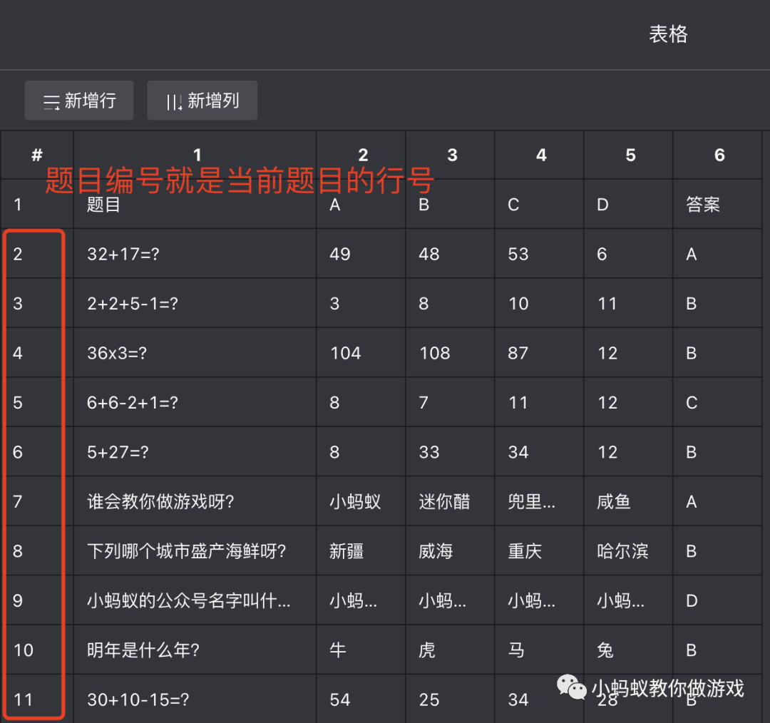 题目编号其实就是题库表格中对应的题目的行号,看一下,这个行号跟题目是不是一一对应的关系呢?比如说当前获取了题目编号 7,根据这个行号,我就能拿到对应“谁会教你做游戏呀?”的题目了。