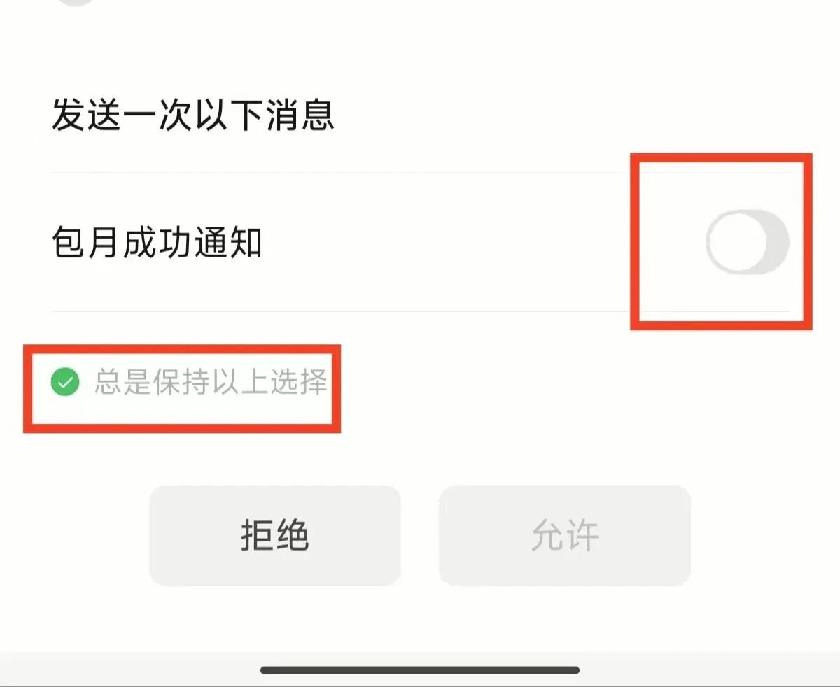 小程序订阅消息弹出对话框,让用户选择是否接收通知时,默认选择不接受,并且默认勾选了总是保持以上选择。
