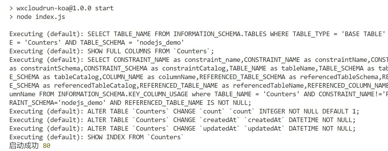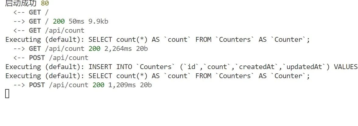 一些熟悉的sequelize 执行的脚本,最后启动成功 监听80端口! 同样,docker desktop内也可以看到容器已启动: