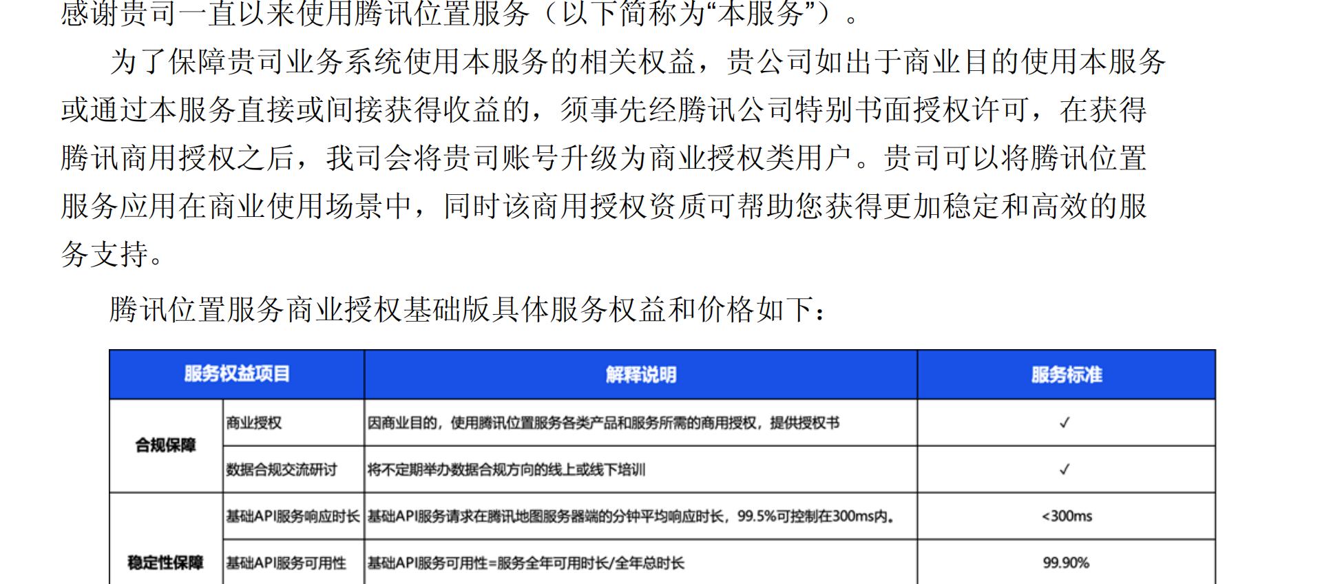 感谢贵司一直以来使用腾讯位置服务(以下简称为“本服务”)。 为了保障贵司业务系统使用本服务的相关权益,贵公司如出于商业目的使用本服务 或通过本服务直接或间接获得收益的,须事先经腾讯公司特别书面授权许可