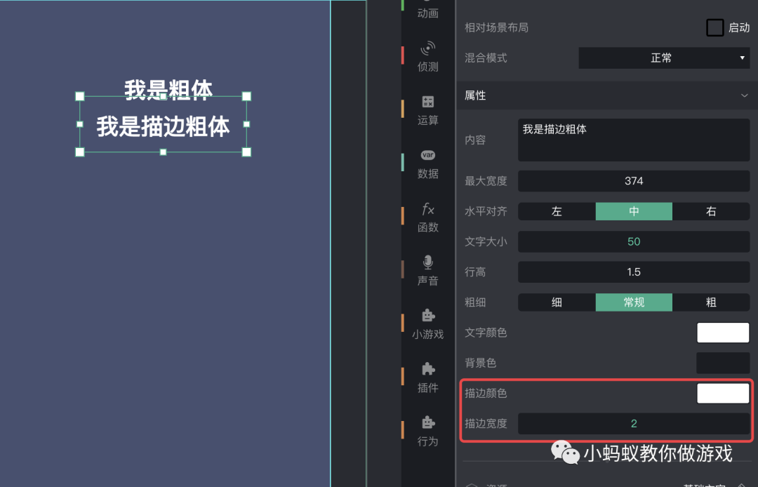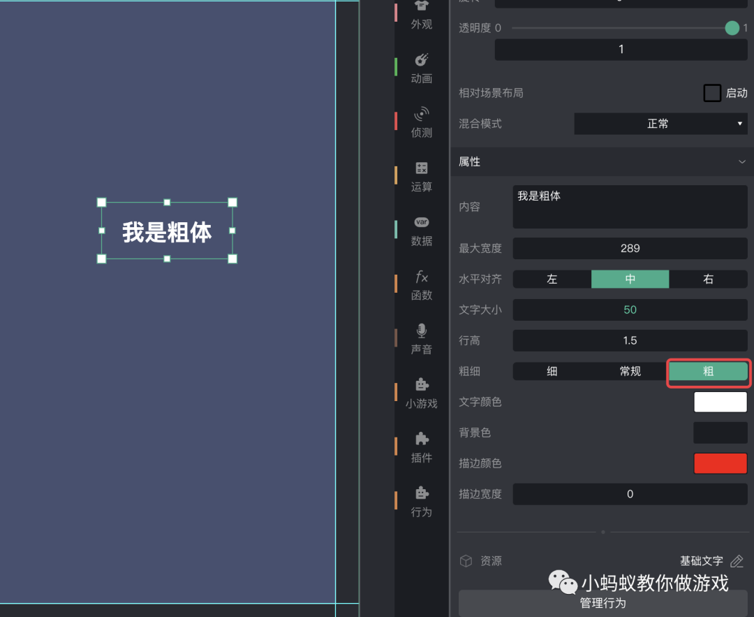 在微信小游戏制作工具中设置粗体很简单,选中要设置的文字,然后在属性区中的“粗细”中,选择“粗”即可。如下图,在工具中会正常显示粗体文字,而且在电脑上预览时,也会正常显示粗体文字。