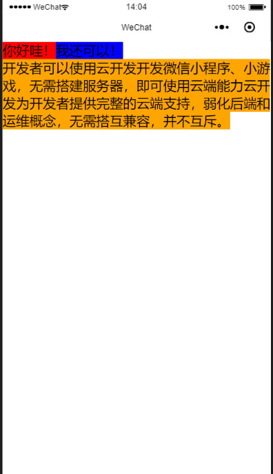 通过上面可以看到<text>普通情况下指定宽高是没有用的,那要怎么办呢?在这里就需要wxss的display属性来控制它是行内还是块级元素了,在对应的wxss样式里面加上 display: block ; 就可以使<text>变身,现在它既可以设置宽高,也可以加外边距等等,还是通过代码看看