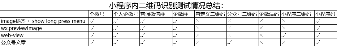 小程序中各类二维码、小程序码,在各种场景下,长按识别支持情况验证结果