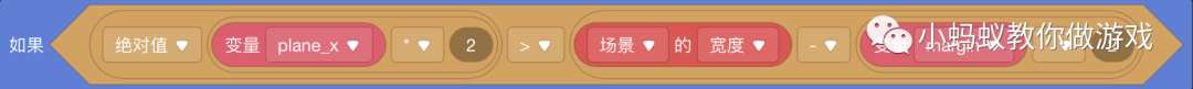 先来看一下左边的部分,plane_x 是飞机当前的位置坐标 x,它的数值可能是正的(在屏幕右侧)也可能是负的(在屏幕左侧),这里使用“绝对值”就可以把两种情况一并包含在里面。