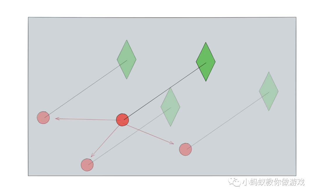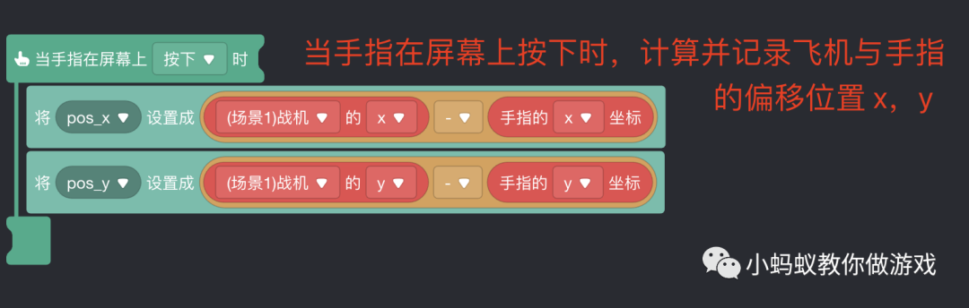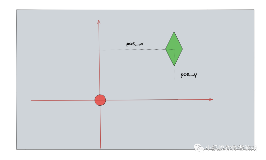 假设绿色棱形表示的是飞机,红色圆点表示的手指在屏幕上按下的位置。此时,我们以红色的圆点为中心构建一个坐标系,那么绿色飞机相对于红色圆点的水平位置(pos_x)就可以使用“飞机的x坐标 - 红点的x坐标”,绿色飞机相对于红色圆点垂直位置(pos_y)就可以使用“飞机的y坐标 - 红点的y坐标”。
