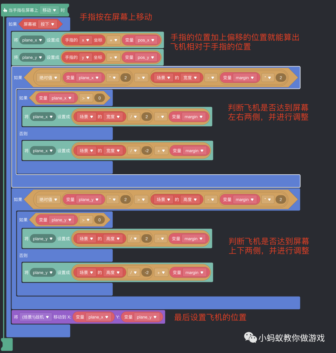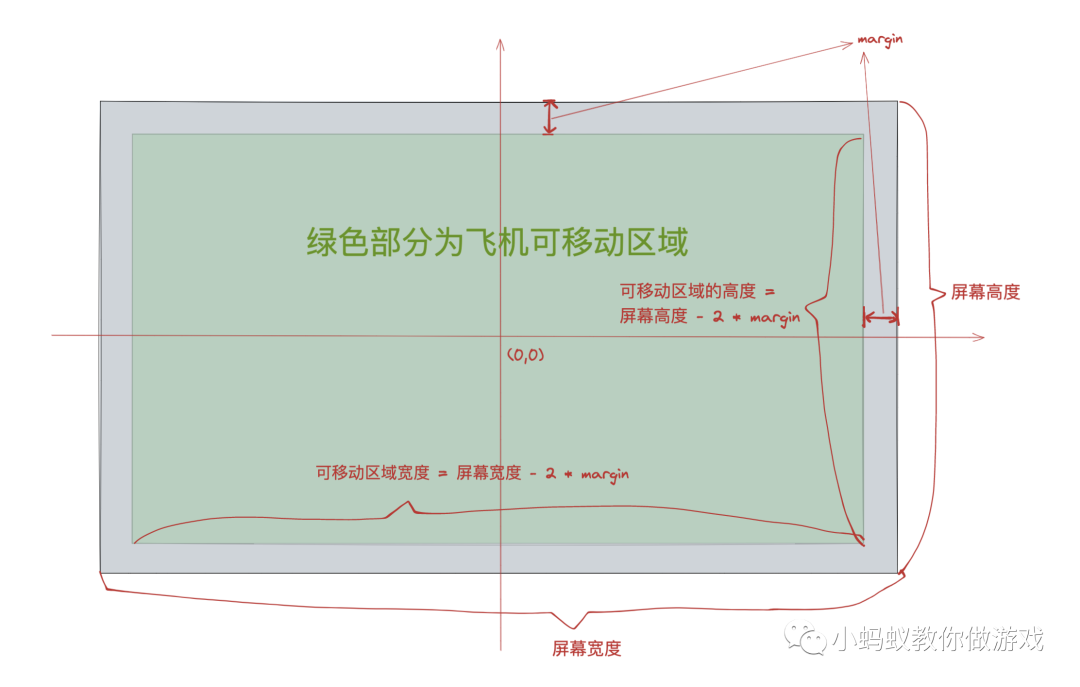 上下两侧的判断也是一样的道理,这个就是限制飞机在指定区域移动的原理了。当前示例的 margin 指的是屏幕四个边缘的间隙,你完全可以根据游戏的需要,单独设置左右两侧和上下两侧的间隙。