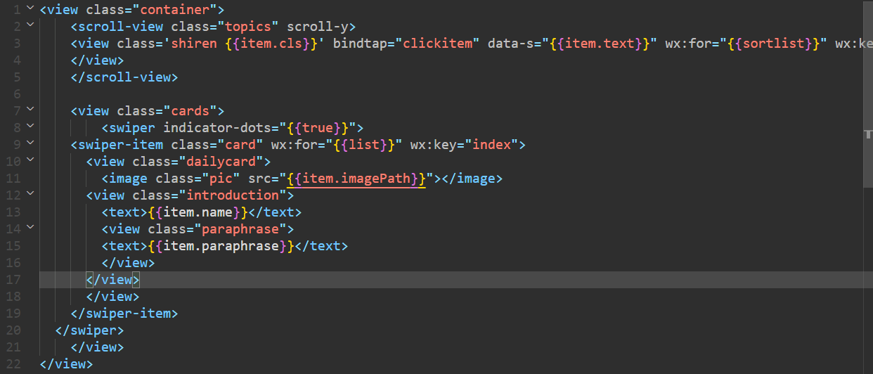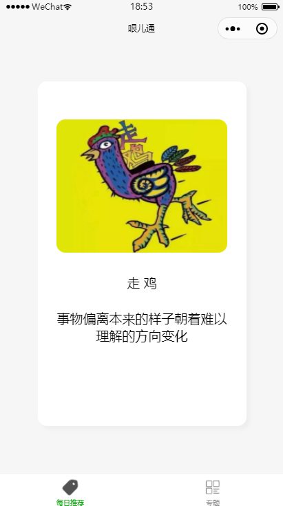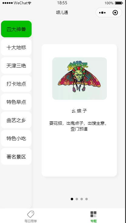 该小程序题材为旅游导航类,整体界面采用简约风格,干净的卡片营造一种轻松的氛围,用户在使用时通过分类中卡片来获取信息,卡片信息与图片上传至云数据库,小程序端进行云调用,结合wx:for列表循环,将内容展示在卡片上;专题页通过wxss创建一种类似选项表的效果,每个选项通过引入一种tag属性实现卡片组的跳转。
