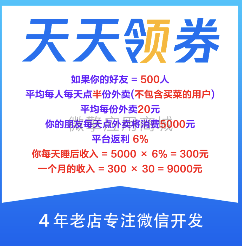其实各种电商外卖平台都有推荐返佣系统,申请后,可以生成你自己的小程序链接,用户点击后领券,订餐使用优惠券你就可以获得返佣。
