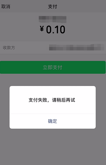V3调起微信支付,参数一切正常,输入密码后,会loading卡住然后提示“支付失败,请稍后再试”,无论密码正确还是错误统一这样显示