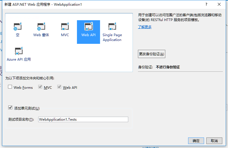 选择 WEB API 模板(选择Web API 时会添加对MVC 的支持)