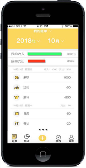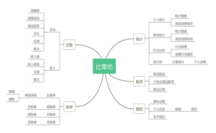 我们对市场上的记账软件比如:鲨鱼记账、随手记等进行了使用与调查,团队讨论中结合它们的优点,添加我们自己的亮点,在记账、查阅账单等基础功能之上,添加了统计与推荐功能,下图是项目的功能模块图: