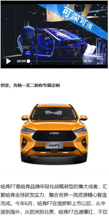 哈弗F7是哈弗品牌年轻化战略转型的集大成者,汇聚哈弗全球研发实力,整合世界一流资源精心智造而成。今年6月,哈弗F7在俄罗斯上市以后,从中国到海外,从欧洲到北美,哈弗F7迅速爆红,不仅获中俄两国元首签名,作为大国外交新名片走进克里姆林宫,而且还登上纽约时代广场大屏,站在了世界的十字路口,成为了中国品牌的骄傲。