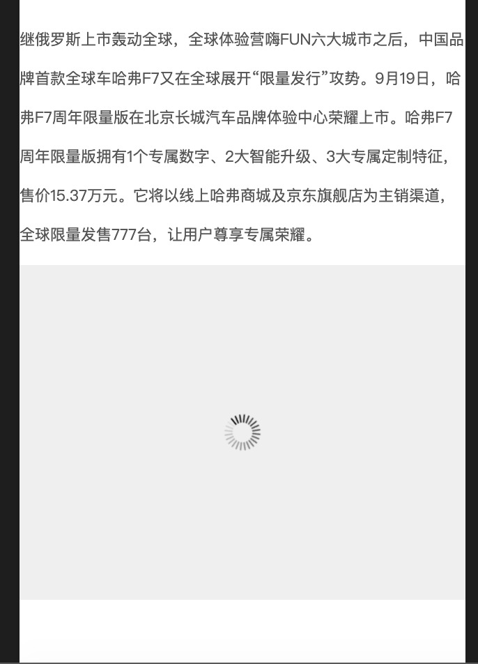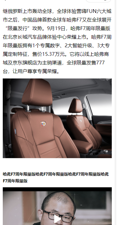 继俄罗斯上市轰动全球,全球体验营嗨FUN六大城市之后,中国品牌首款全球车哈弗F7又在全球展开“限量发行”攻势。9月19日,哈弗F7周年限量版在北京长城汽车品牌体验中心荣耀上市。哈弗F7周年限量版拥有1个专属数字、2大智能升级、3大专属定制特征,售价15.37万元。它将以线上哈弗商城及京东旗舰店为主销渠道,全球限量发售777台,让用户尊享专属荣耀。