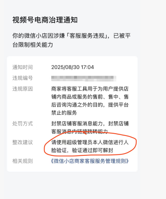 操作路径如下:使用超级管理员账号电脑浏览器访问微信小店后台(https://store.weixin.qq.com/),在后台首页或通知中心会有明显的“待处理”或“违规提示,点击进入违规详情页面,即可看到清晰的 【人脸验证】 按钮,扫码验证通过后,系统会立即提示“验证已通过,能力已恢复”。
