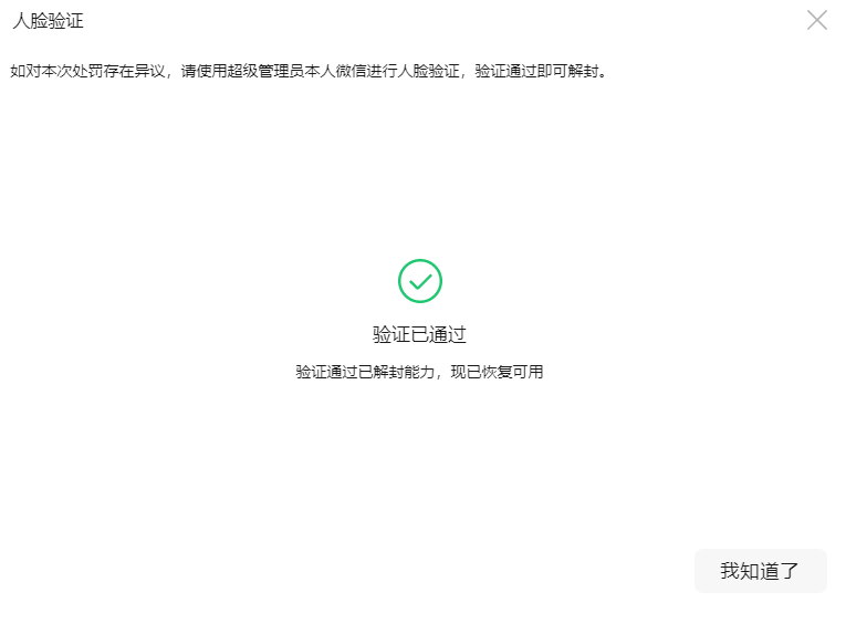 整改建议是: 请使用超级管理员本人微信进行人脸验证,验证通过即可解封。