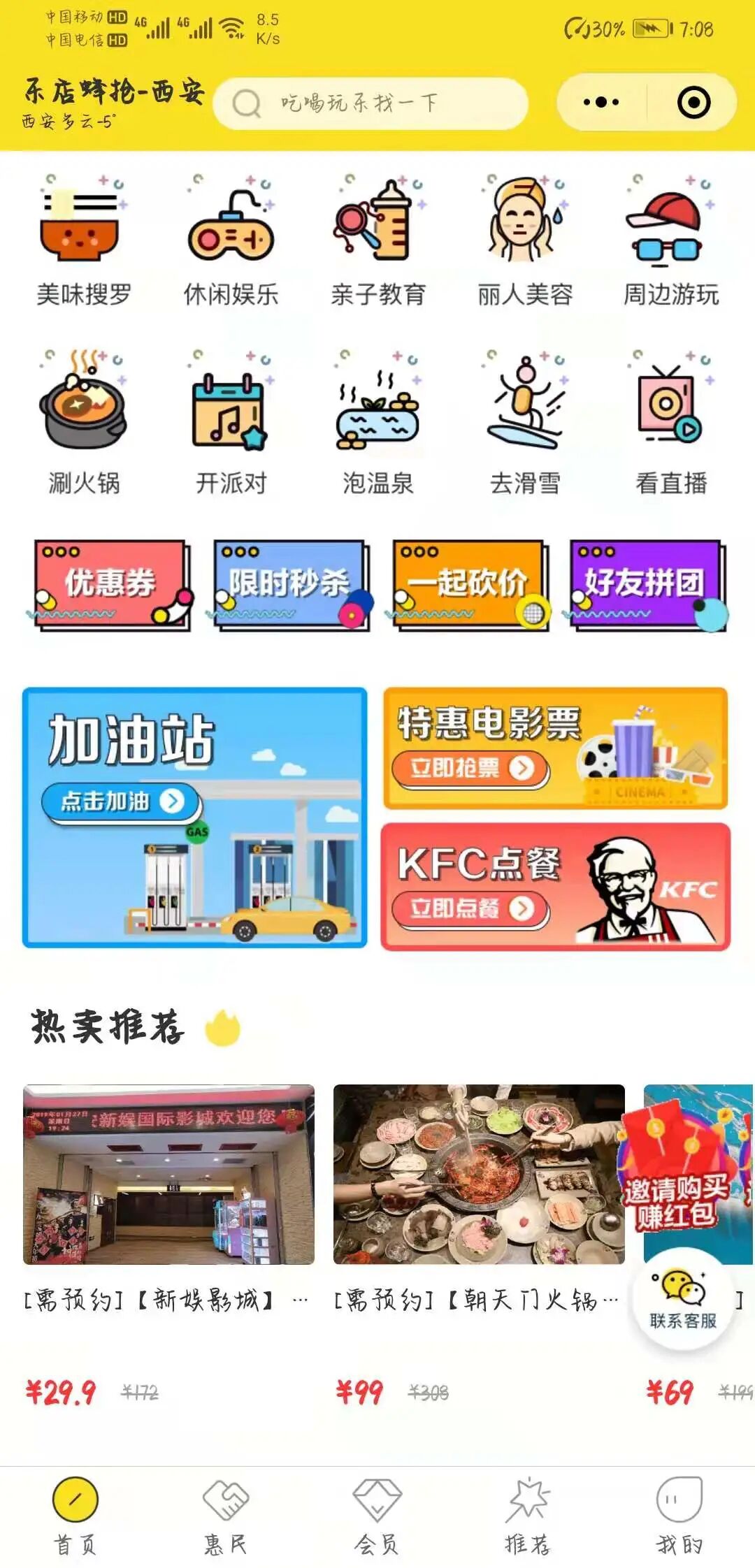 乐店蜂抢社交电商小程序,四川省成都市武侯区品牌代理权以及小程序一起转让,图片是公司的西安站点,本地运营的话有公司总部帮忙,现在小程序已经接入了全国的加油站,电影院以及肯德基,价格有绝对优势,平台可以自己售卖全国包邮的商品,入驻的商家也可以售卖自己店铺的商品,商家在平台也可以做外卖,跟美团有合作的,商家可以自己选择自己配送或者让外卖员配送,因为在山东还有其它事情要做,顾不上这边,现将品牌代理权和小程序一起转让,有意私聊