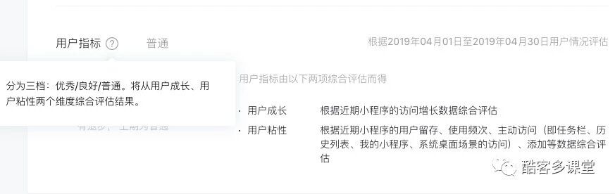 用户指标主要从用户成长和用户粘性两个角度考虑,比较看中用户体验。我们可以理解为,性能指标为商家解决了技术性难题。商家只需要做好小程序,做好用户服务。
