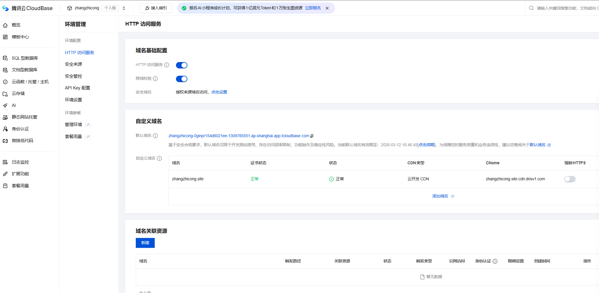 如果以上操作后还是不行,直接在开发工具的云开发控制台-更多-静态网站-网站配置中添加自定义域名。