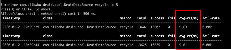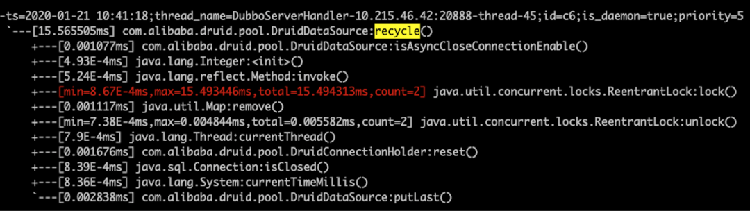 这个现象其实表明要么是获取连接后没有立即查询或者是还连接慢,于是用 arthas (https://github.com/alibaba/arthas) 统计返还连接的平均时间: