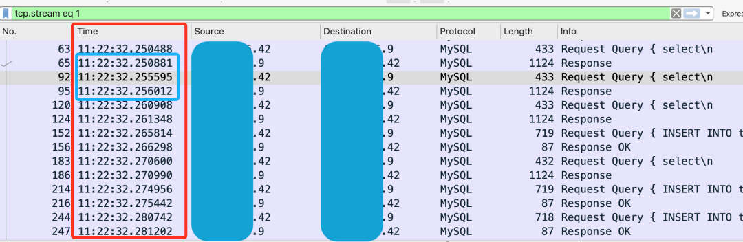 首先怀疑是否是 DB 的瓶颈,于是用 mysqlburst(https://github.com/xiezhenye/mysqlburst) 模拟核心请求,并发 500 下写入(insert) 能达到 4w 左右,应该来说还有比较大的优化空间。不过应用 T 在碰到瓶颈后尝试过扩容 2 台服务器后性能没提升,DB 的确是重点怀疑对象,于是在压测期间抓包: