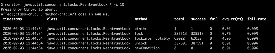 ## 进入 arthas 后使用 monitor 命令查看方法的统计信息