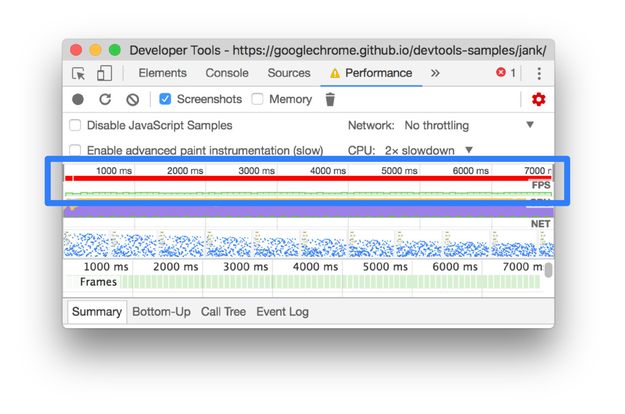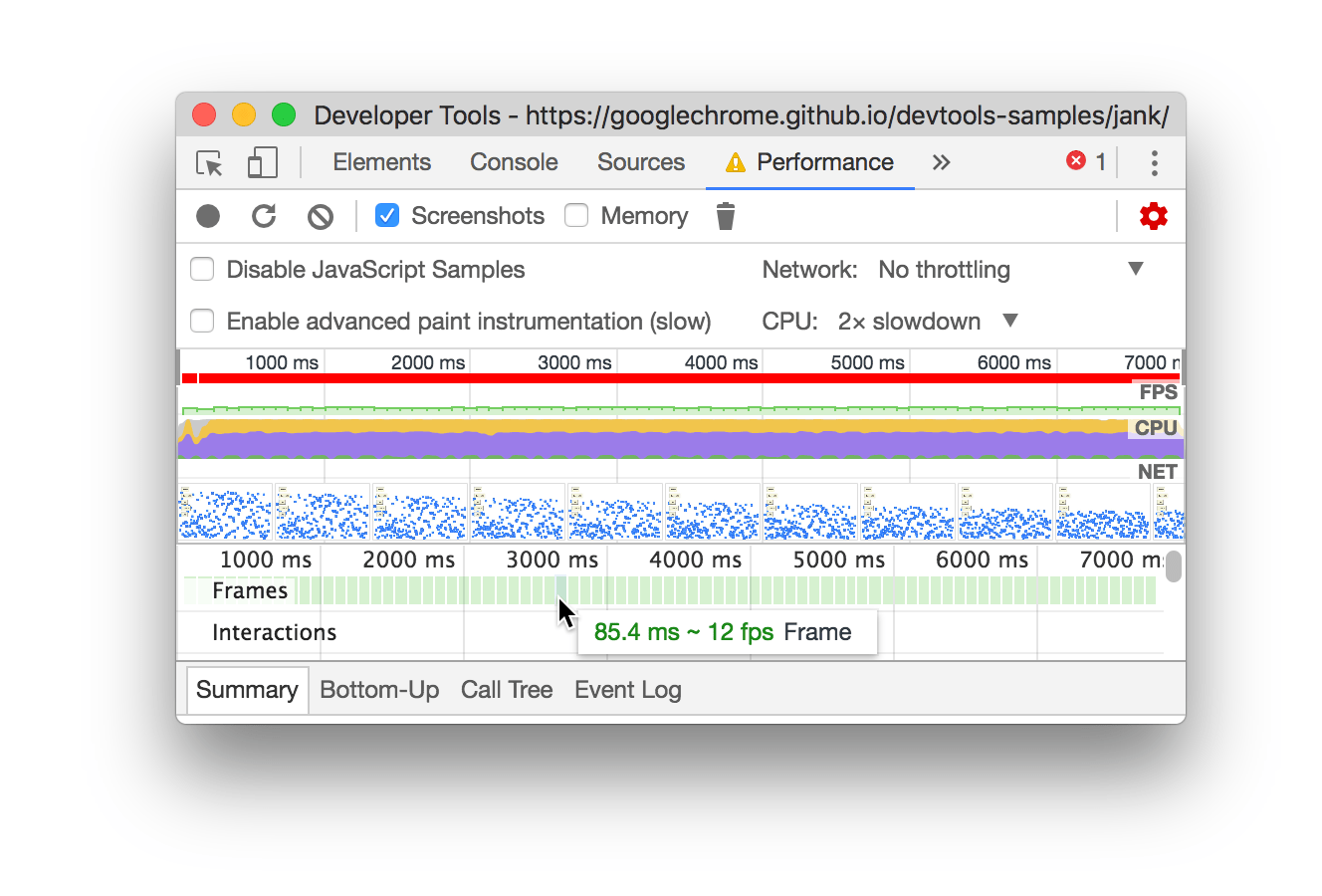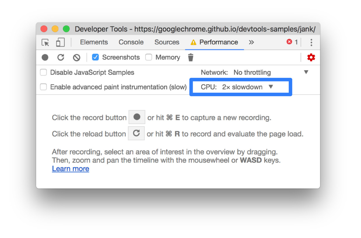 注意:在测试其他页面时,如果要确保它们在低端移动设备上工作良好,请将CPU节流设置为减速20倍。这个演示不能很好地使用20倍的减速,所以它只使用2倍的减速作为教学目的。