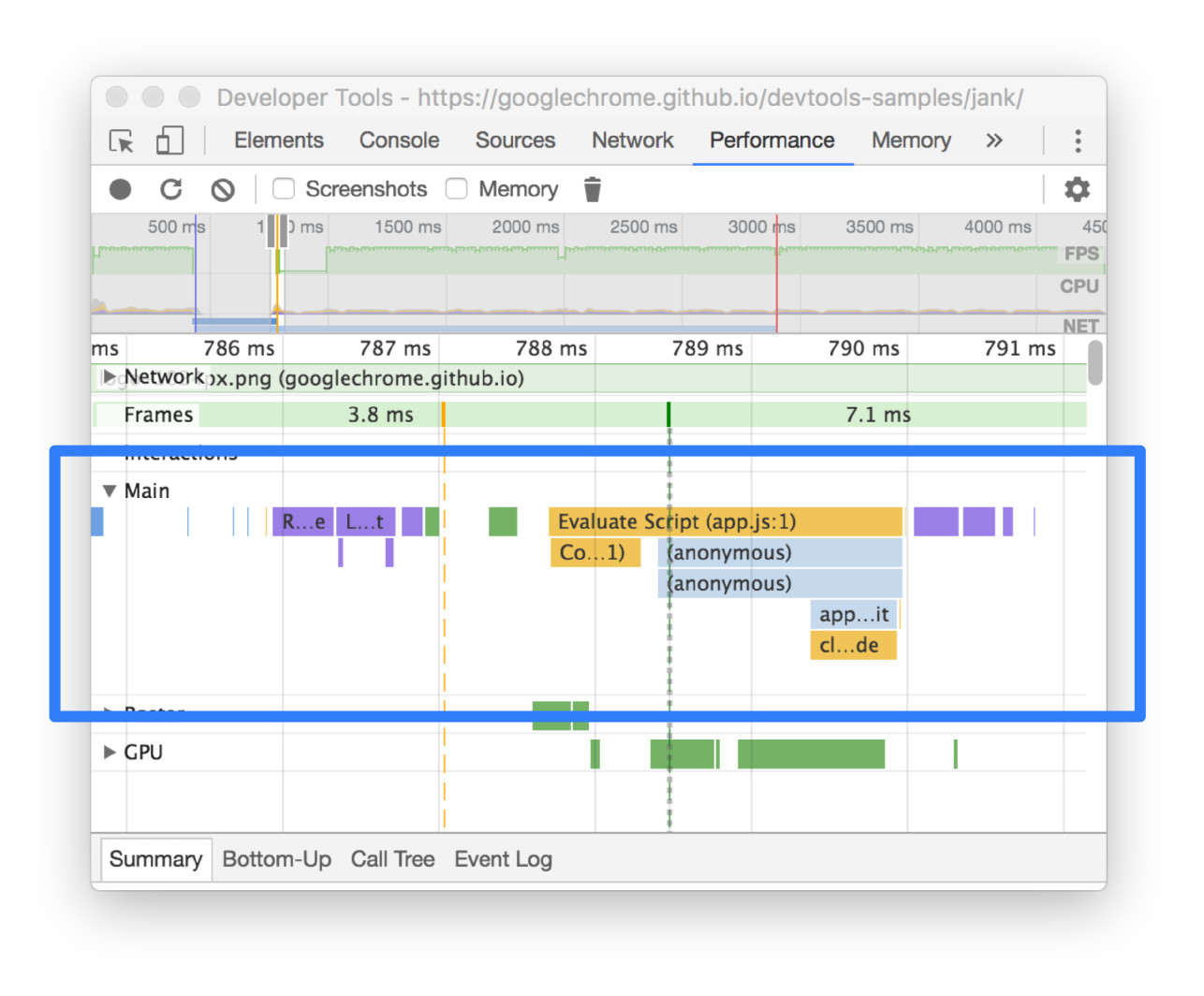 - 记录过程中有很多数据。在 OverView 面板(有 CPU, FPS, NET 图表的区域)上,用鼠标单击、按住、拖拽来放大单个 Animation Frame Fired 事件。此时 Main 和 Summary 中展示了选中的区间的相关信息。