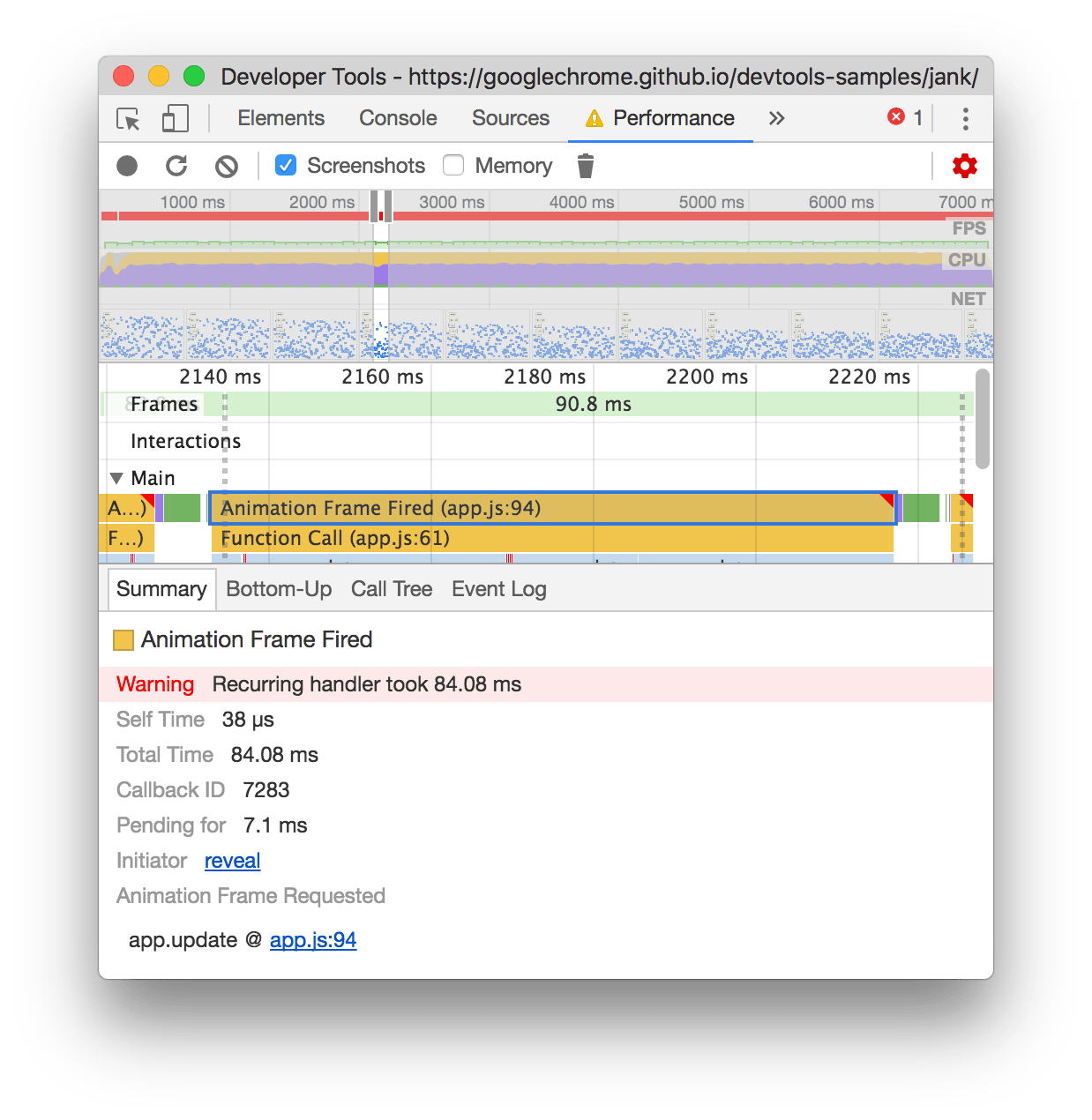 单击某个 Animation Frame Fired 事件, Summary 中会展示与该事件相关的信息. 注意 reveal 链接,单击后,DevTools 会将触发当前的 Animation Frame Fired 事件的事件高亮出来。同时注意 app.js:94 链接,单击后跳转到相应的源码。