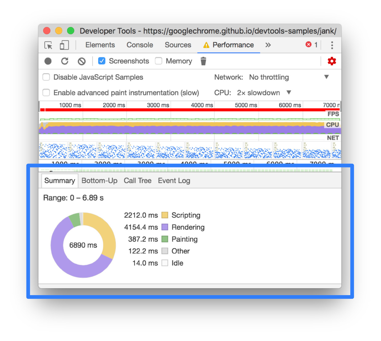 - 注意 Summary 选项卡,在未选择任何事件时,它呈现了浏览器在整个记录过程中把时间花在哪个部分。可以看到,页面的大部分时间都花在渲染上。所以现在的目标就是:减少浏览器花费在渲染工作上的时间。