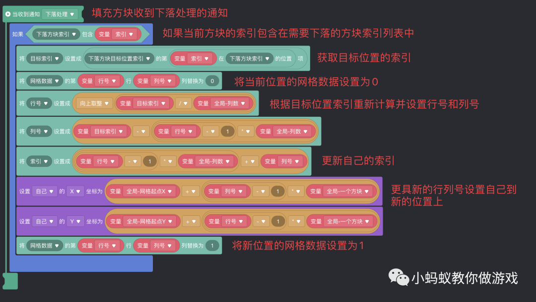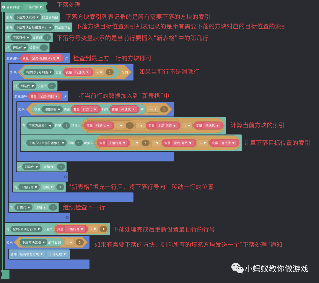 这里你可能发现了,我并没有创建一个“新的表格”,上方图片中的“新的表格”只是方便我们理解整个下落处理过程,实际的逻辑中只需要知道当前的行需要插入到新表格中的哪一行(下落行号)即可,我们使用了两个列表来记录了需要进行移动处理的方块的索引,以及它对应的需要移动到的新位置的索引。