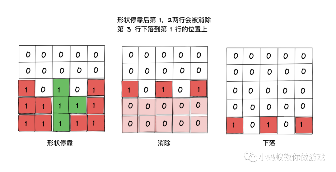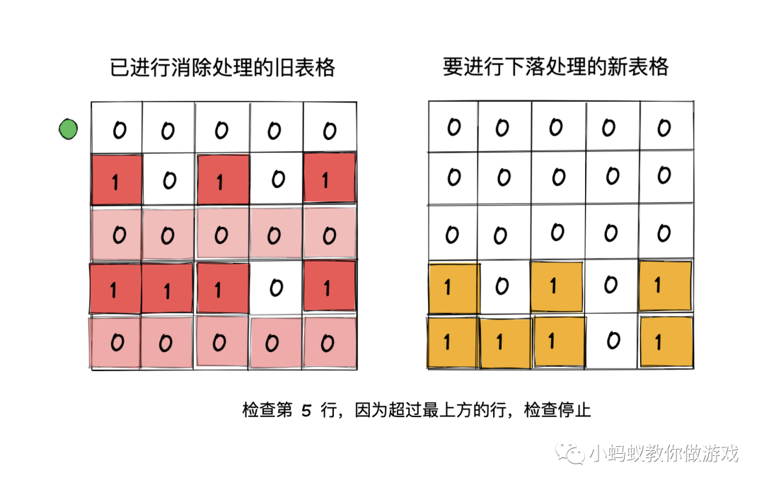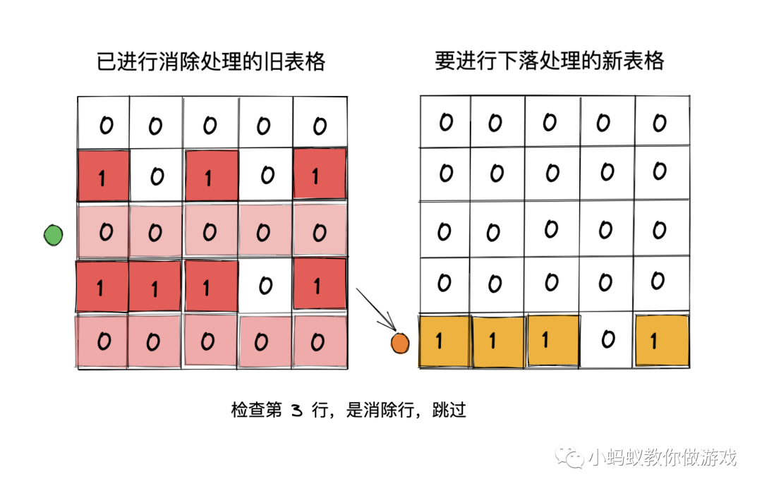 我们试着根据数据表格重新描述一下下落的过程:从表格最下方的第一行开始,逐行向上遍历检查,如果当前行是消除行,就直接跳过这一行。如果当前行不是消除行,就将当前行插入到新的表格中,直到检查到最上方的一行为止。