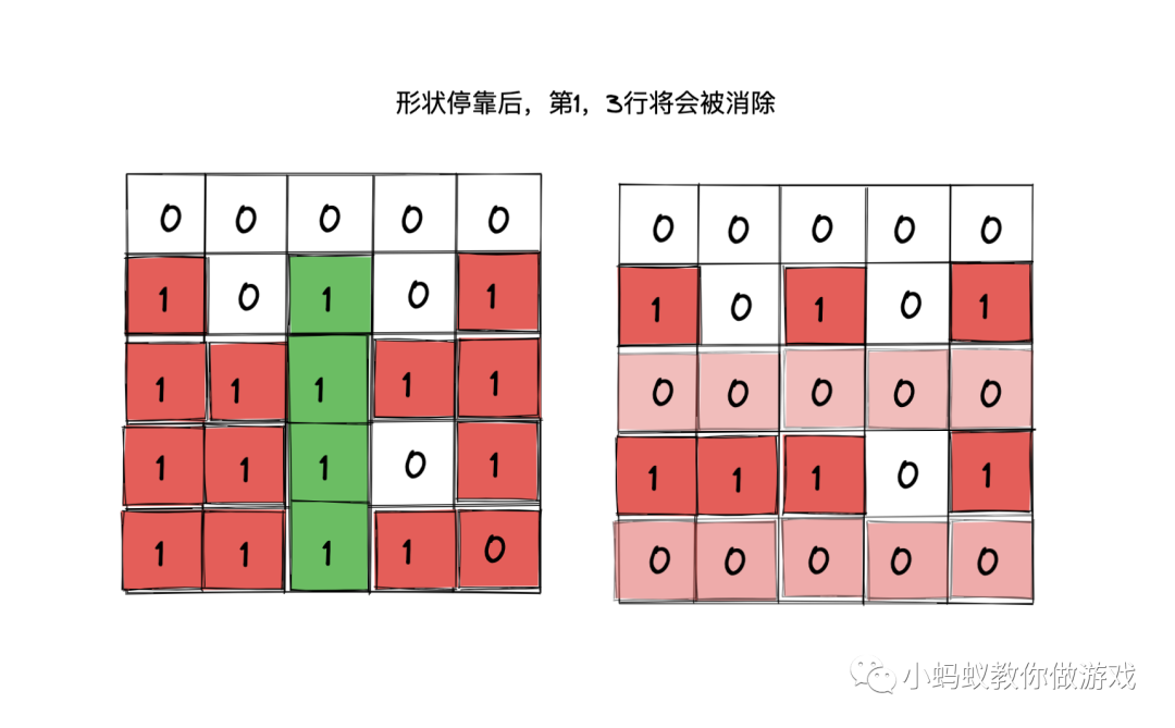如图,形状停靠后第 1,3 行将会被消除,我们就以当前的这种情况来演示一下下落处理的过程。
