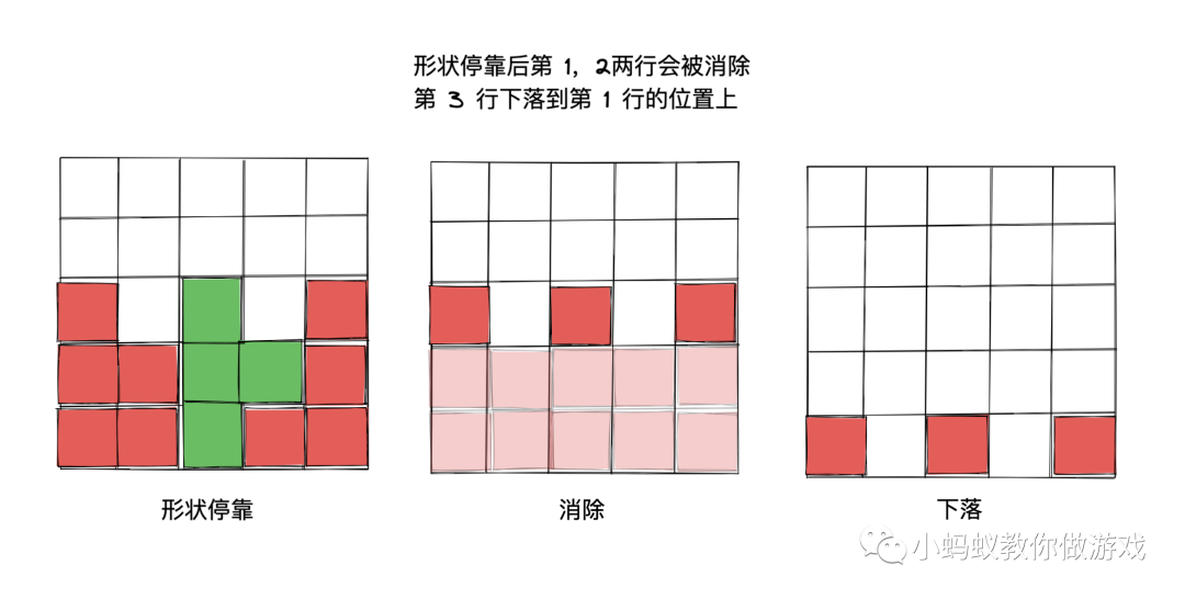 如图,“下落处理”是在消除完成之后进行的,消除完成之后,上方的未被消除的方块会下落,直到碰到下方的其它方块或者是第一行为止。