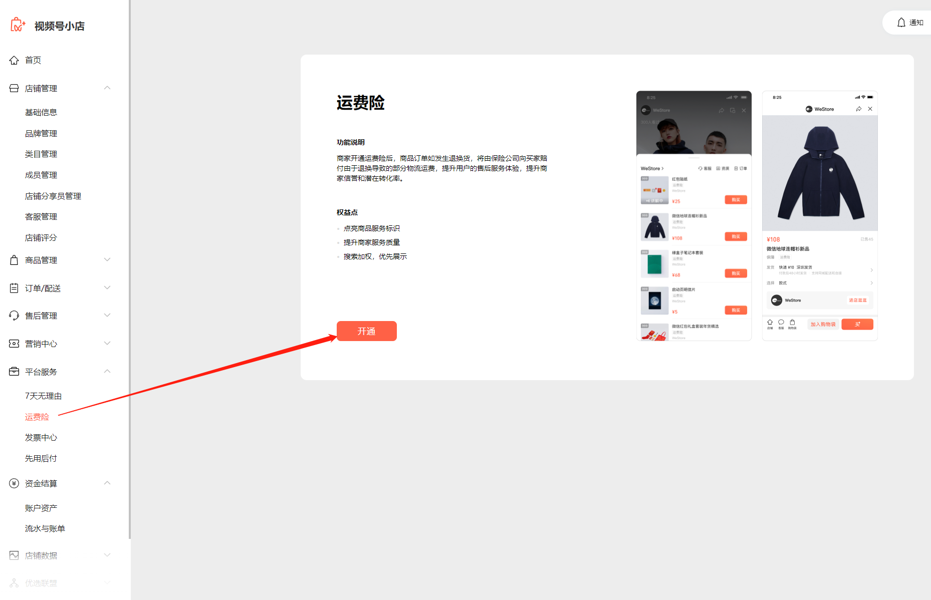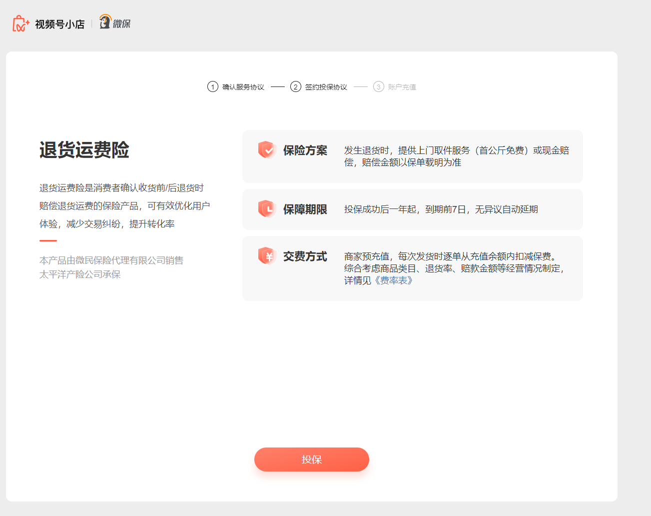首先登录店铺后台侧边栏-平台服务-运费险,点击开通会跳转新的页面,我们可以看到是太平洋保险公司承保,微民保险代理。我们点击投保,继续点击确认协议。这时就签约成功了,然后我们返回视频号小店,继续点击运费险开通,管理员扫码确认即可。