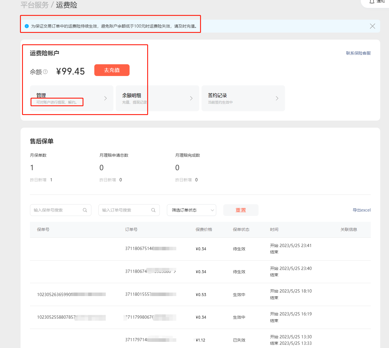 保证账户最低100元(低于100元运费险功能失效),充值成功后,所有商品默认运费险标识。当商户每15天超过500单,保险公司会实时厘定商家风险率,然后决定增加或减少一定的保险费。调整幅度为-40%,60%,如果退货退款高于28%,保险公司有权拒绝商家投保。
