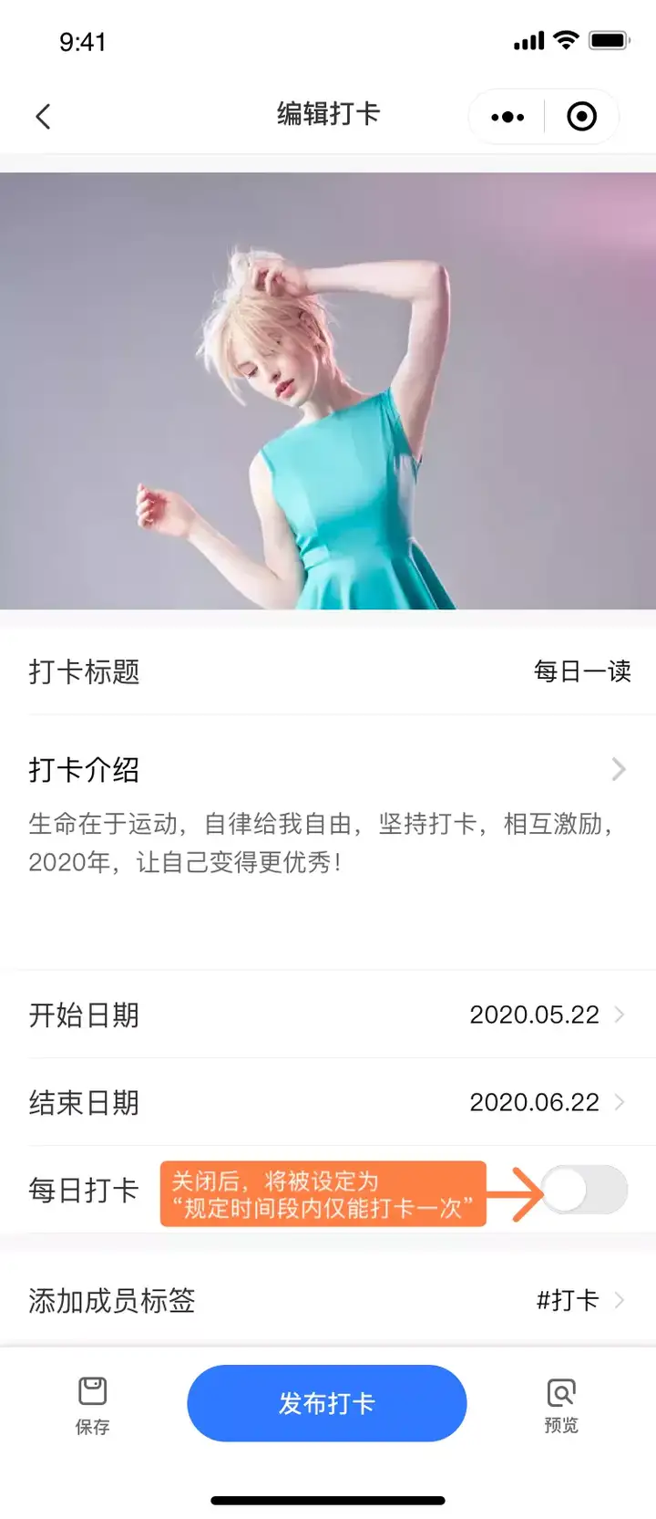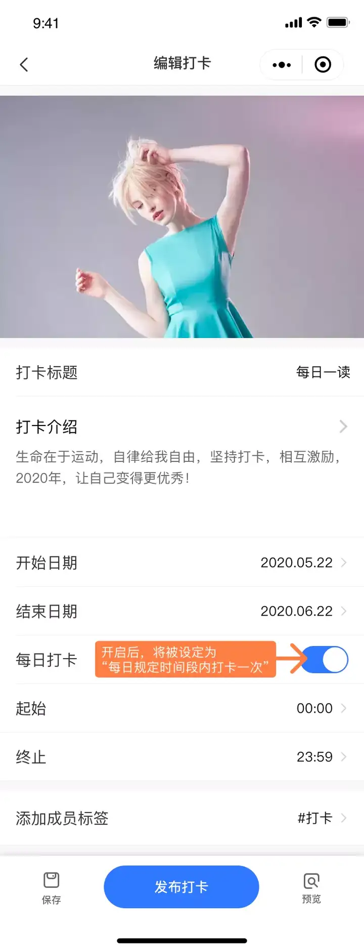 - 填写打卡活动的相关信息,确认无误后即可发布(支持后续修改);