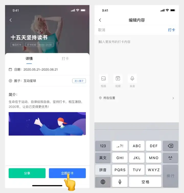 在互动星球中创建打卡,成员在参与打卡时,可选择文字、图片、视频、音频的内容形式,发布相应的内容完成打卡。同时,成员在发布内容时还可以发布位置信息,可根据实际情况进行选择使用。
