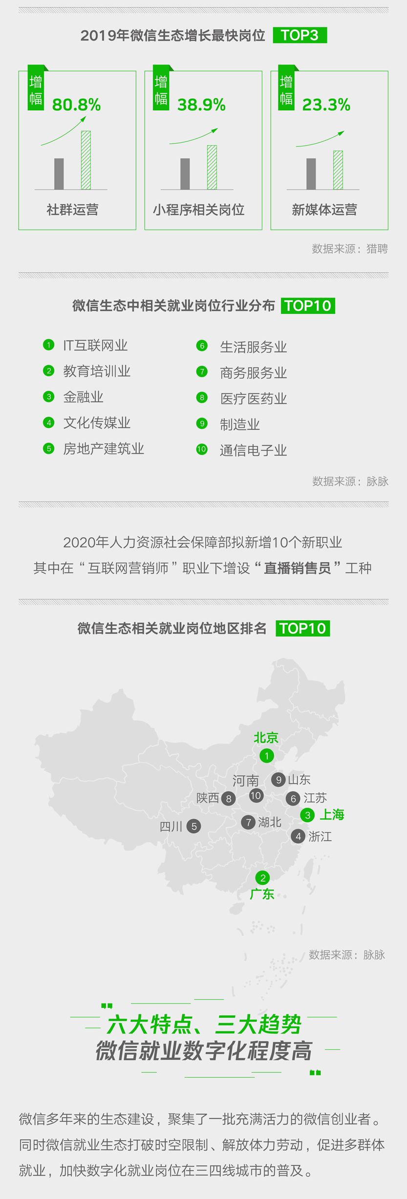 微信就业数字化程度高,呈现六大特点,包括年轻人/大学生是就业主力军、重点帮扶人群更易在微信找到新机会等;