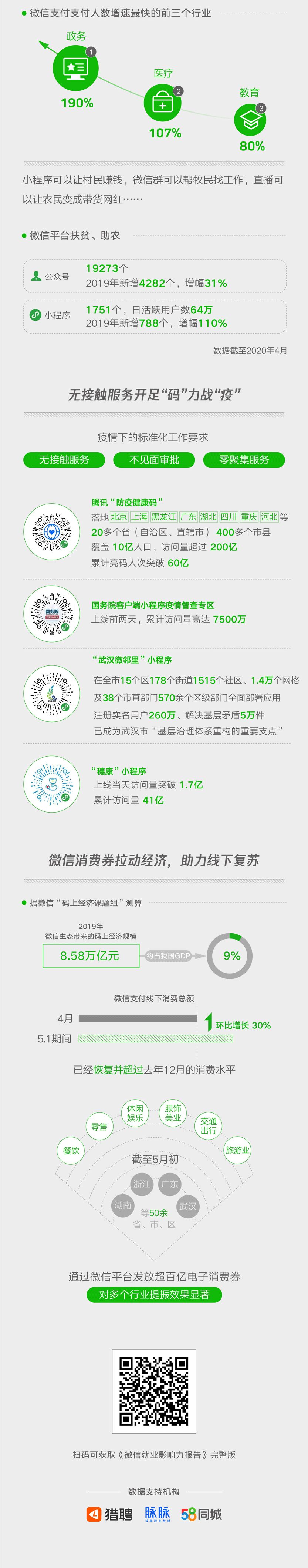 5月14日,微信联合中国信通院发布了《2019-2020微信就业影响力报告》,从不同角度完整呈现了微信在经济社会发展中的重要作用。