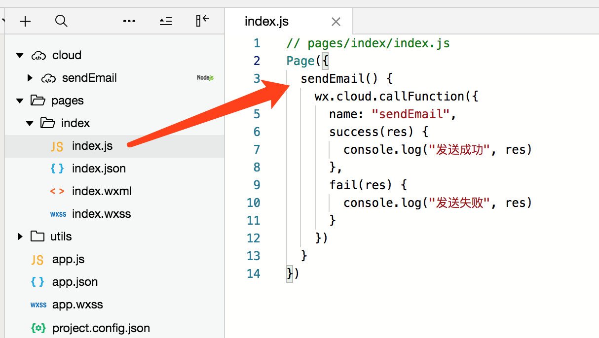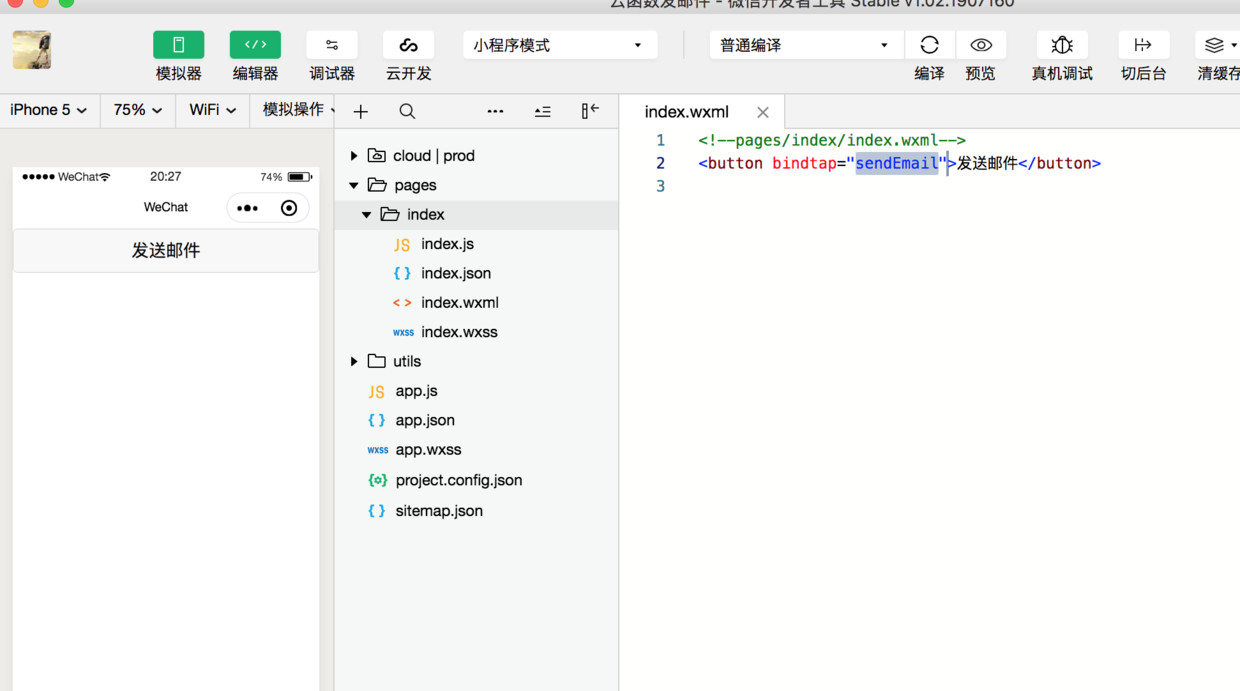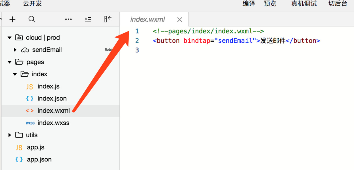 我们在index.wxml文件里写一个按钮,当点击这个按钮时就发送邮件。