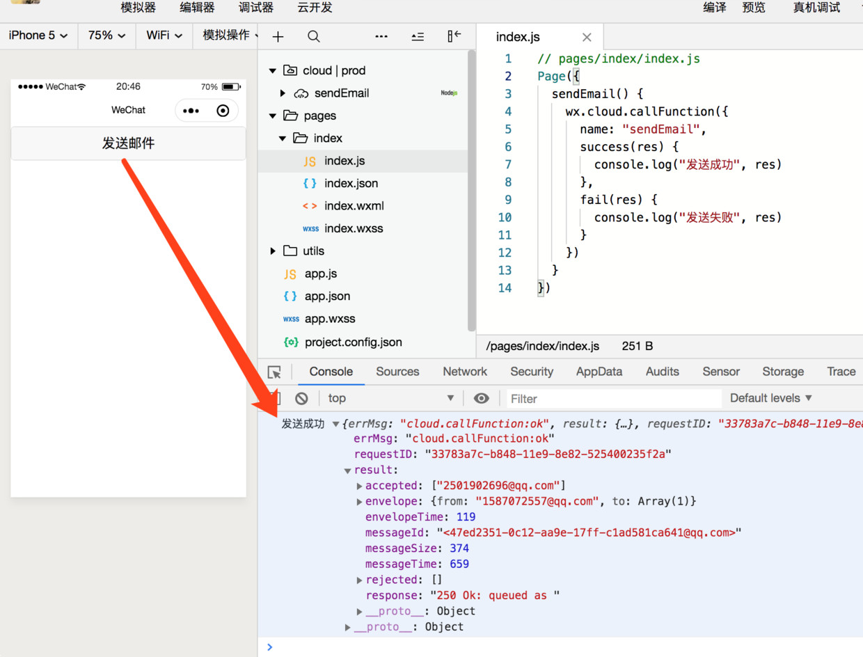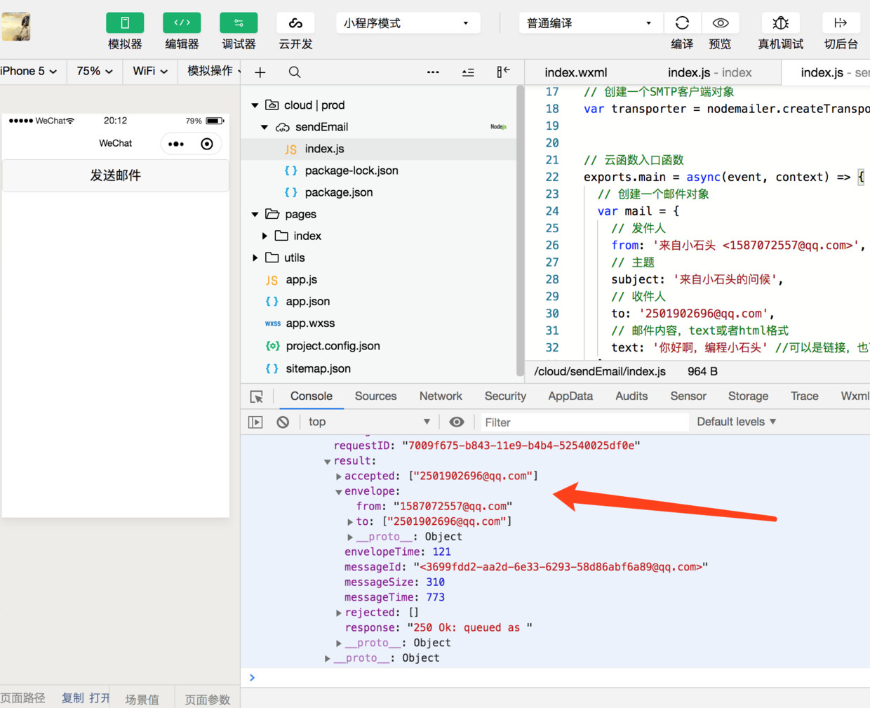 到这里我们就完整的实现了微信小程序云开发使用云函数发送邮件的功能了。是不是很简单呢。