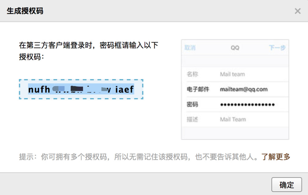 我们获取的授权码如下图。这个授权码,我们后面发送邮件时会用到。