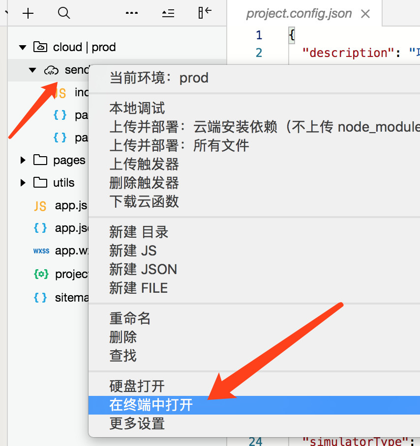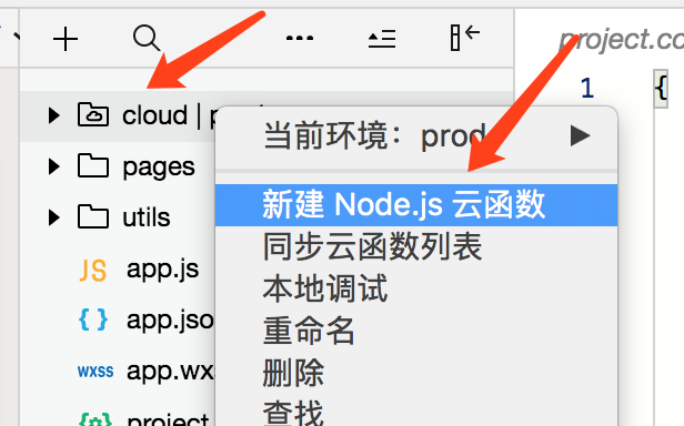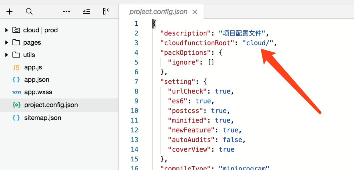 3,在project.config.json里配置云函数目录,如下图箭头所示