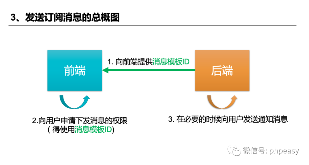 给用户发送订阅消息这个功能比较复杂,我们这里给大家画了一个流程图,总共需要分为3步: